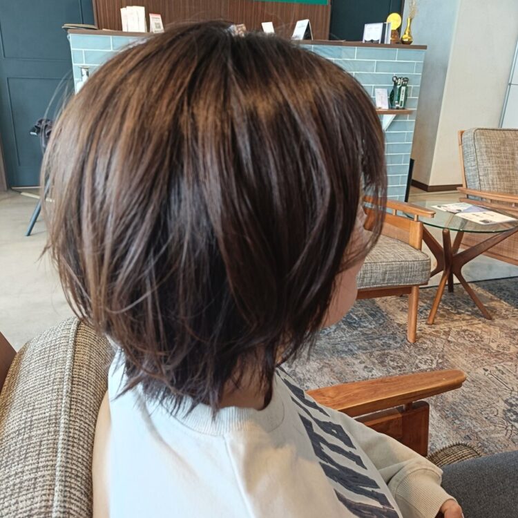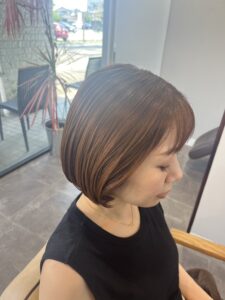 アゴ下の丸みあるボブと明るいサンドベージュ系カラーの相性抜群です。