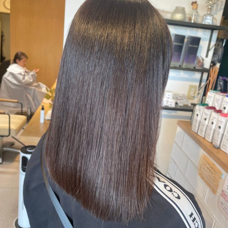 カラーは黄ばみをしっかり抑えたシルバー系をベースに、ほんのりラベンダーを感じる配合に。ブリーチ履歴のある髪でもギラつかず、上品で落ち着いた色味になるよう調整しています。時間が経っても色落ちがきれいなのも、このカラーの魅力です。