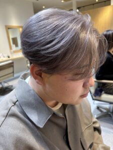 スタイリングはドライ後に軽めのバームやオイルを少量なじませるだけ。ツヤと束感が出て、シルバーカラーの透明感がより引き立ちます。作り込みすぎないラフさが、今っぽさを演出してくれます。