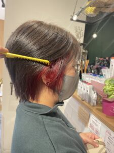 耳周りの内側だけをブリーチして、深みのあるレッドをオン。普段は上の髪で隠れるので派手すぎず、耳にかけたり動いた時にチラッと見えるのがとてもおしゃれなポイントです♪