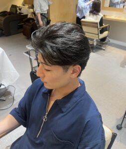 スタイリングは、ドライ後に軽めのワックスやバームをなじませるだけでOK。ラフにかき上げるようにセットすることで、自然な毛流れとツヤ感が引き立ちます。ビジネスシーンでもプライベートでも好印象を与えやすい万能スタイルなので、初めての方やイメチェンしたい方にもおすすめです。